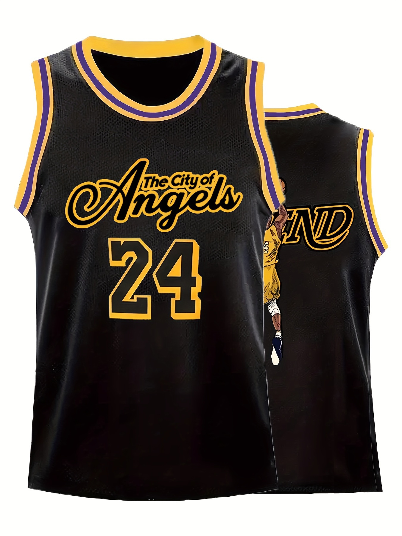 [Comfortable] Men's #24 "The City of Angels" Black Basketball Jersey - Breathable, Lettering & Numbering, V-Neck Sleeveless Sports Uniform for Training & Casual Wear, Summer Ready