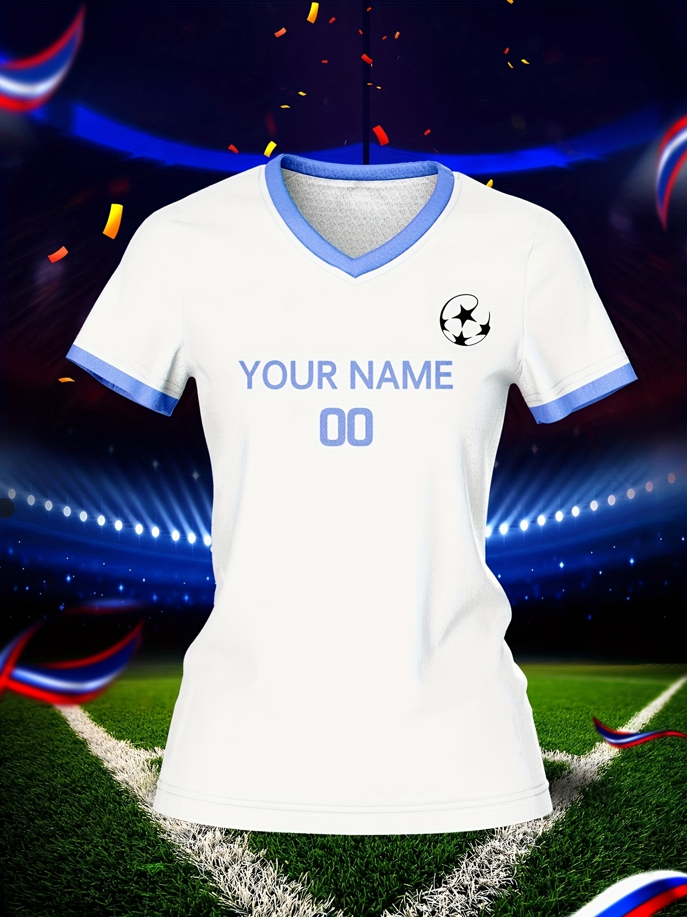 Customizable Women's V-Neck Soccer Jersey - Personalized Name & Number, Breathable Polyester, Quick-Dry Sports Top with Blue Accents for Team Training & Casual Wear, Team Apparel | Customizable Soccer Shirt | Knit Construction